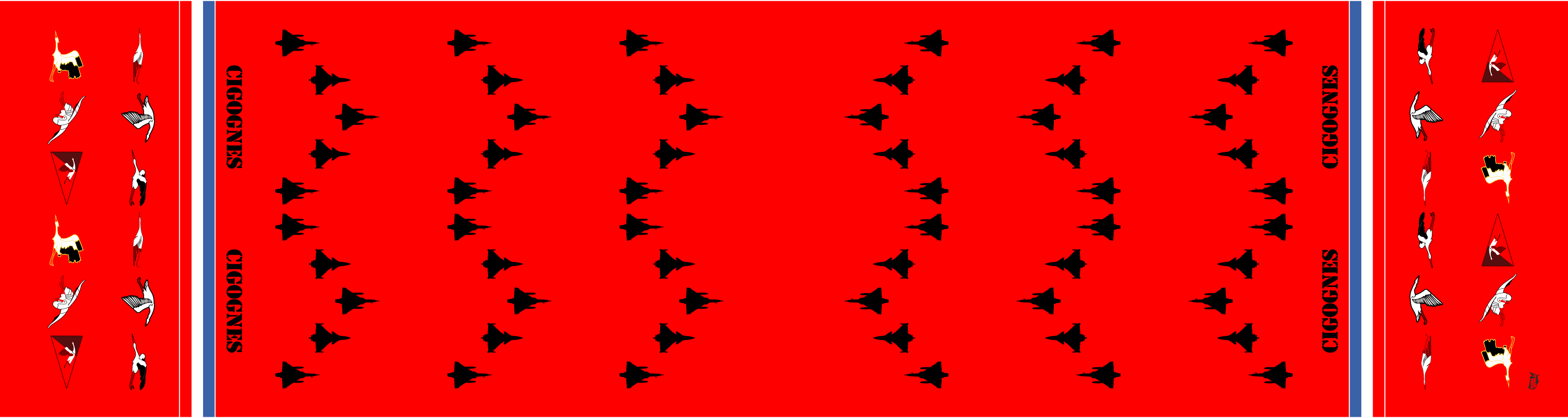 France Cigognex 25 Flight Scarf. Red Background With Dassault Mirage 2000-5F Aircraft Pattern & Wings On The End Of The Scarf. Size: 6" x 48".