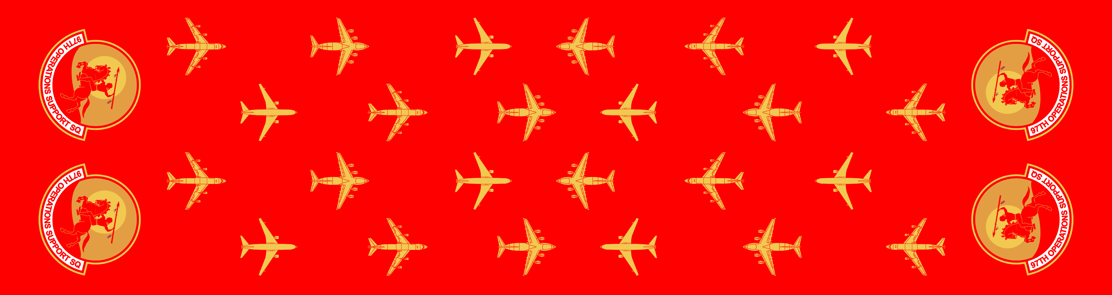 Altus AFB 97 OSS Flight Scarf. Red Background With 97 OSS Patches on the ends, C-17, KC-135 & KC-46 Aircrafts Along the Body of the Scarf. Size: 6" x 48".