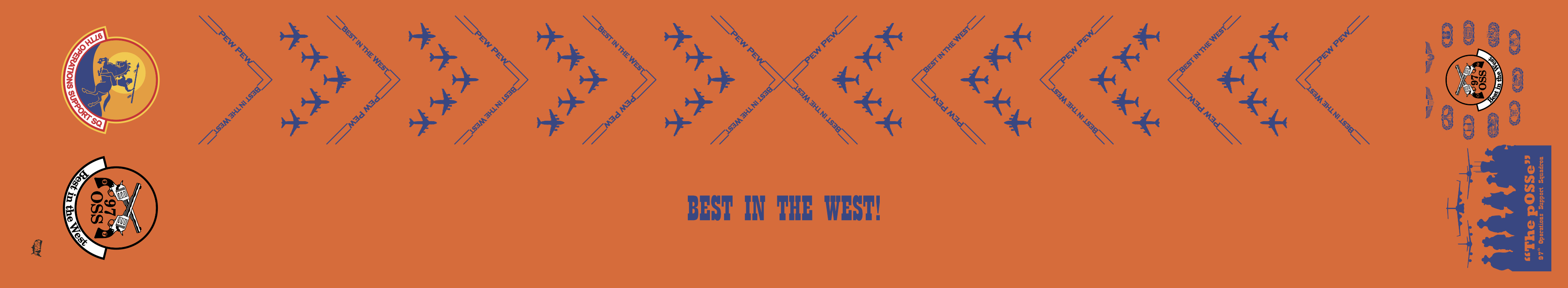 Altus AFB 97 OSS Flight Scarf. Orange Background With SQ Patches/Logo On The Ends, Aircraft Pattern & "Best In The West!". Size: 4" x 48".