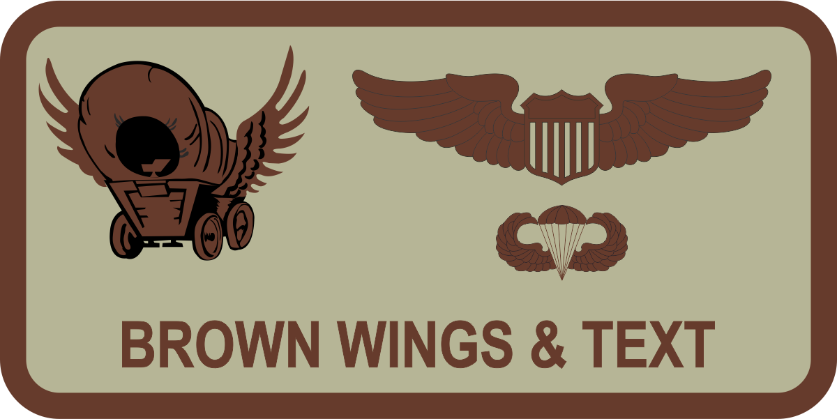 Dyess 39 AS Desert Name Tag, - Tan background, brown border, wings & text, brown/black-winged coach logo, with leather backing