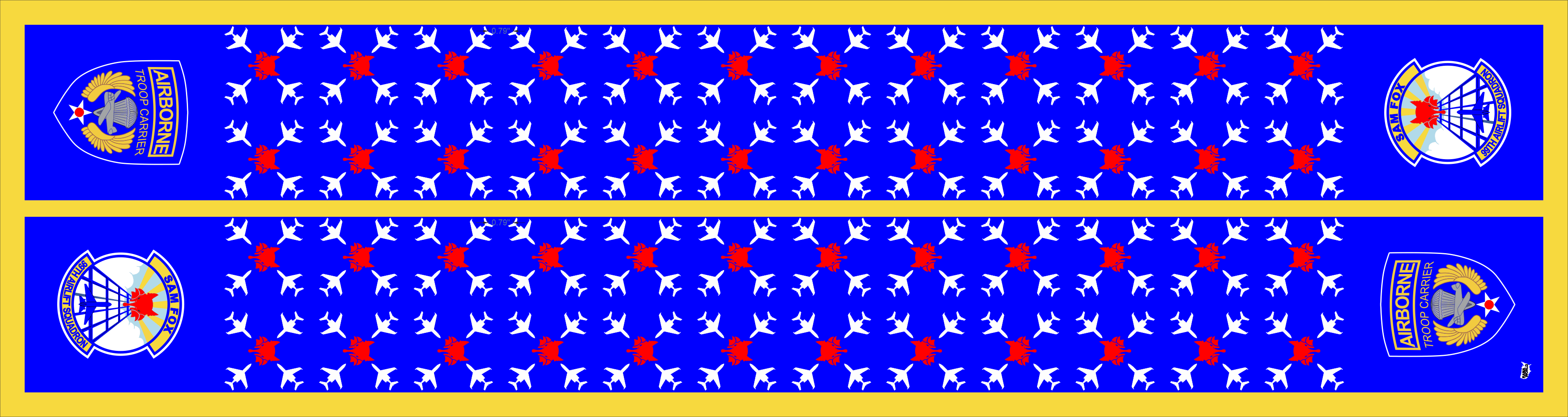 Andrews AFB 99 AS Flight Scarf. AF Blue Background With A Yellow Border, C-37 Aircraft & Sam Fox Emblem Through Out The Center Of The Scarf, & Patches On The Ends. Size: 6" x 48".