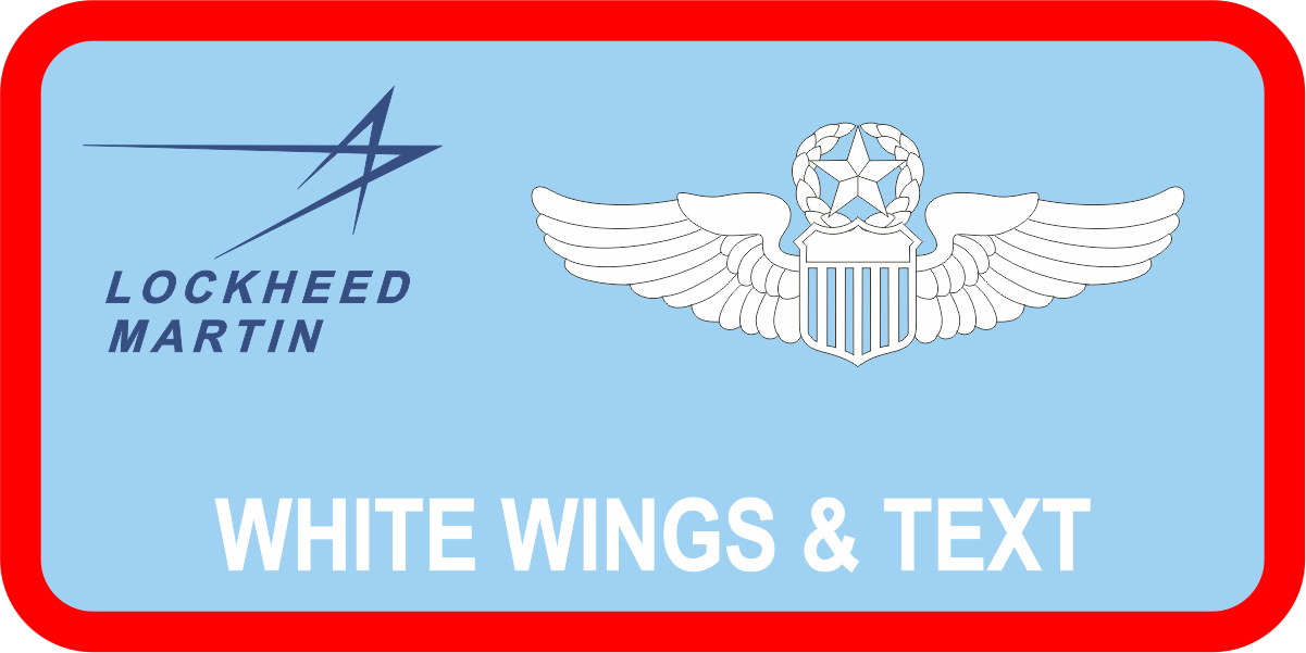 Systems Software Integration Lockheed Martin Name Tag- Light Blue Background, Red Border, White Wings & Text, with Lockheed Martin Logo in Blue