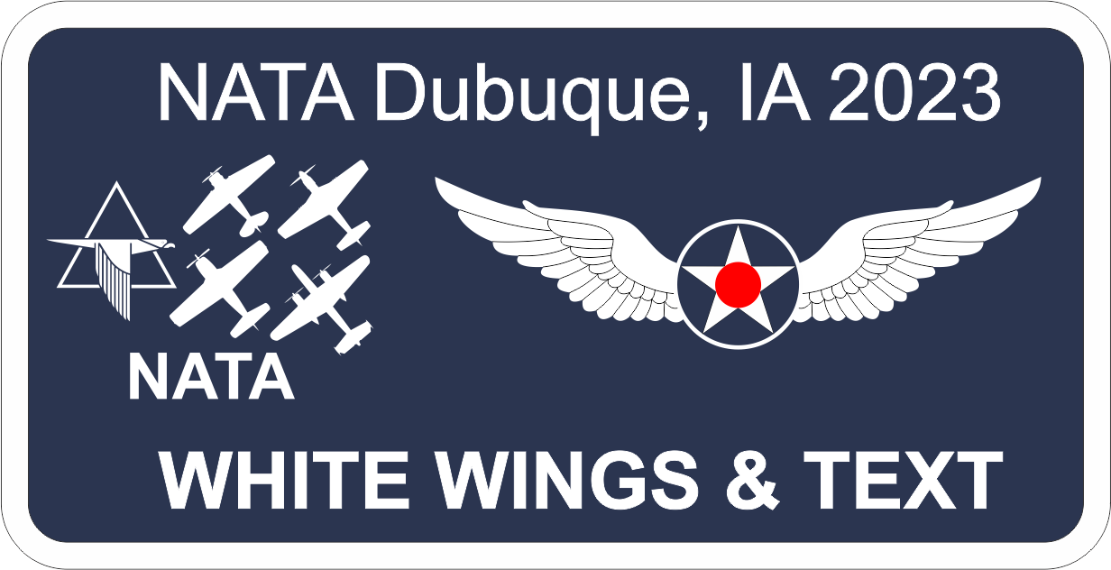 North American Trainer Assoc - NATA Dubuque, IA 2023 Name Tag - Navy Blue Background, White Border, White Aircraft with Eagle Logo, White Wings & Text