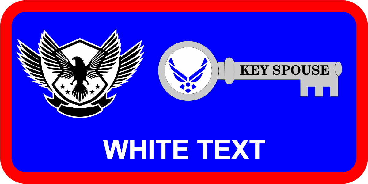 John Evalle Key Spouse Name Tag -- AF Blue Background, Red Border, White, Gray & Blue Key Spouse Logo, White Text