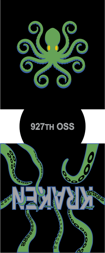 MacDill 927 OSS Black Koozie with SQ Patch Logo, "927TH OSS" Text on the Bottom & "KRAKEN" Text with Tentacles.