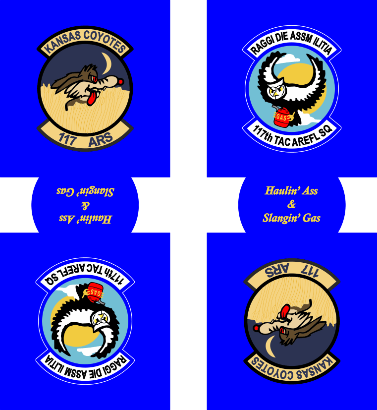 Kansas ANG 117 ARS Koozie. AF Blue With The 117 ARS Kansas Coyotes Patch, 117 ARS Heritage Patch & "Haulin' Ass & Slangin' Gas" Text On The Bottom.