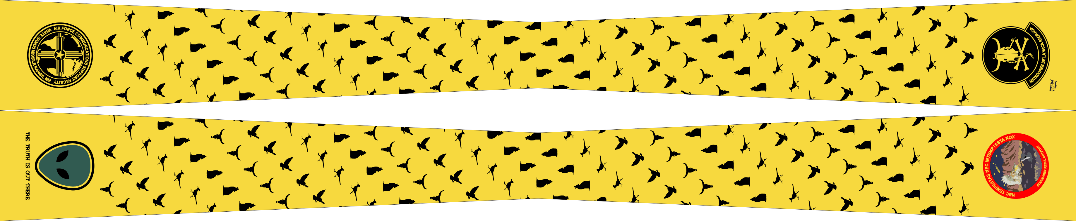 White Sands Missile Range Southwest Rebel Outpost Flight Scarf. Yellow Background With Animal Pattern Through-Out The Scarf & Patch Emblems on The Ends. Size: 4" x 2" x 4" x 48".