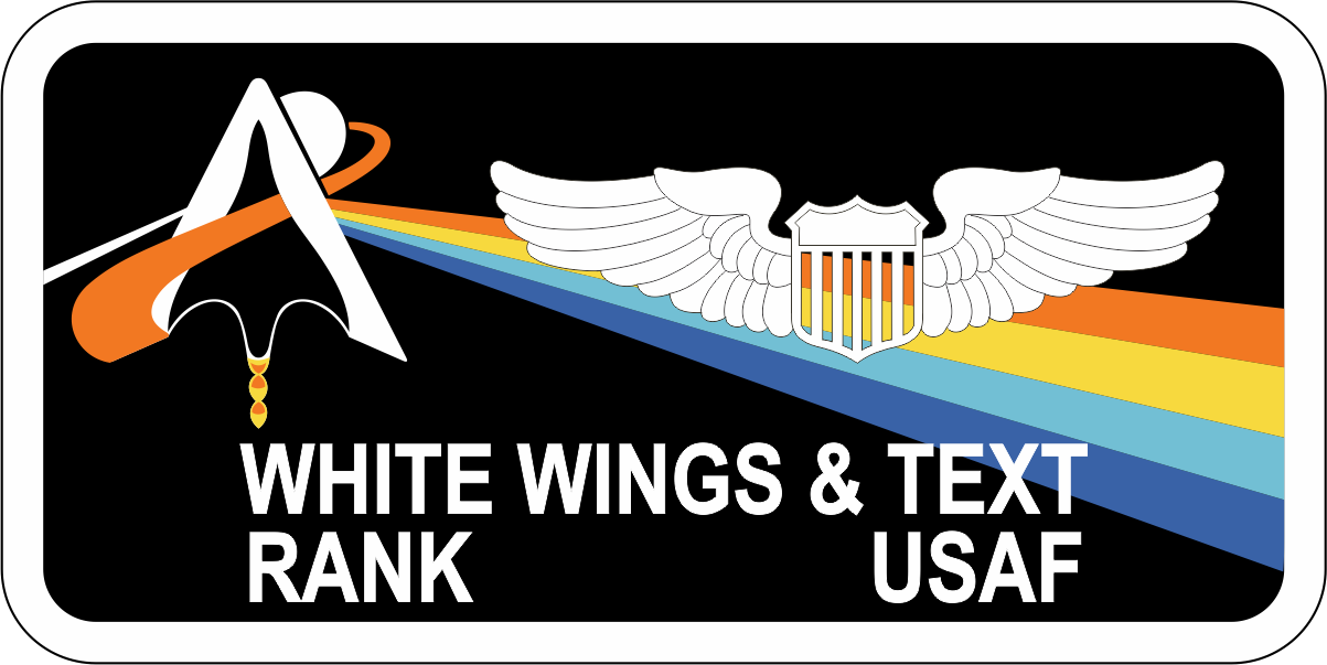 Edwards AFB - Test Pilot School  - TPS Class 26A Name Tag  - Black Background, White Border, White Wings & Text - Aircraft Logo with Blue/Lt Blue/Yellow/Orange Stripes